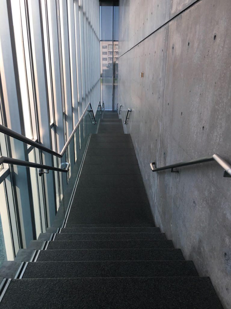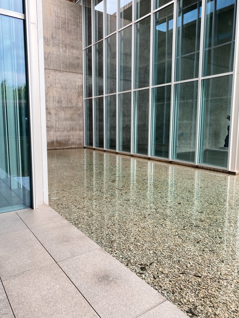 The Modern shares a lot of similarities with the Kimbell, but the two museums are different stylistically. While the Kimbell is a series of vaults faced in travertine, which has a distinctive color and texture, The Modern by comparison is a large, open, L-shaped box and is constructed of concrete and glass. The walls that are facing the parking lot are faced with metal panels, except for the entrance atrium, which is made up entirely of windows. The rear of the building looks out onto a shallow fountain with a rocky floor. That part of the building is faced entirely in windows. There are three “bays” that extend out and overlook the fountain. The massive concrete slab roof over these bays seems to be help up by large concrete columns that look like trees without the leaves. One of the most beautiful features is a long staircase that sits along the rear wall of windows that leads to the second-floor gallery. The view is beautiful. The gallery spaces are a series of rooms with soft white walls. Each gallery has room to display a large canvas. The interplay between the spaces and the solids is what makes the museum visually appealing. The second-floor gallery space seems to float above the first-floor gallery space. There are numerous areas where the second floor stops short, and visitors can look out over the railing to the first floor to see artwork from above. Some of the artwork in the gallery seems to have been made specifically for viewing from this angle. Whereas the Kimbell gallery is open, the Modern is more partitioned, and there are lots of alcoves and small rooms to explore. The anticipation of what you might find in each room makes for a pleasurable viewing experience. I mentioned earlier how the Kimbell makes the visitor feel like they are visiting a Roman temple. The Modern makes you feel like you are in a clearing in the middle of a vast forest. Diane Ghirardo, in her book Architecture After Modernism, describes Tadao Ando’s architecture as attempting to “achieve an oasis of stillness in harmony with nature” (page 97). I can’t think of a better description to summarize the experience of walking through the Modern. Like the Kimbell, I hope it is something everyone can experience at least once in their lifetime.