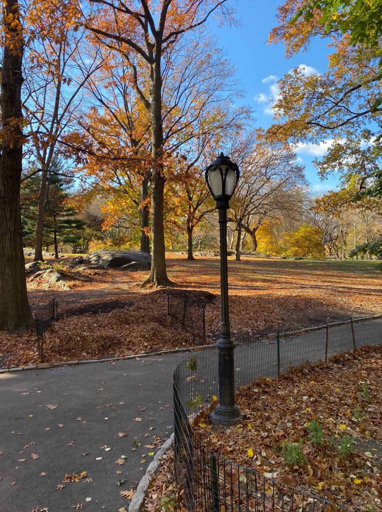 I would call this the quintessential Central Park aesthetic: vintage streetlight, rocks, and autumn colors everywhere.
