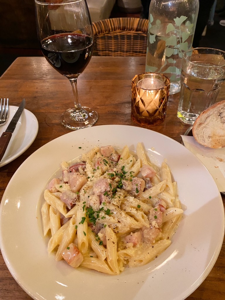 • There was a scene in Wes Anderson’s French Dispatch during the food writer’s segment about traveling alone. In that segment, Jeffrey Wright’s character said that no matter how lonely it got when he was on assignment, there was always a restaurant he could go to where he felt like he belonged. A place where he felt like he was at home. In a restaurant, everyone is there for the same common purpose and eating is a universal action shared by all cultures. It’s an individual act performed in a communal setting. Sometimes it is difficult for me to remember that. That regardless of how I am feeling during a trip, I can always visit a restaurant or a coffee shop. It’s here I can be around people, even though I am dining alone. There is something comforting and humanizing and powerful in that realization. When I walked by this particular restaurant, I immediately felt welcome. The patio was strung with orange string lights and it reminded me of having dinner in the dimly-lit backyard under the starry summer sky as a kid. I sat at a small table near the front window and had carbonara and lemon sorbet and listened to the idle conversation of my fellow diners.