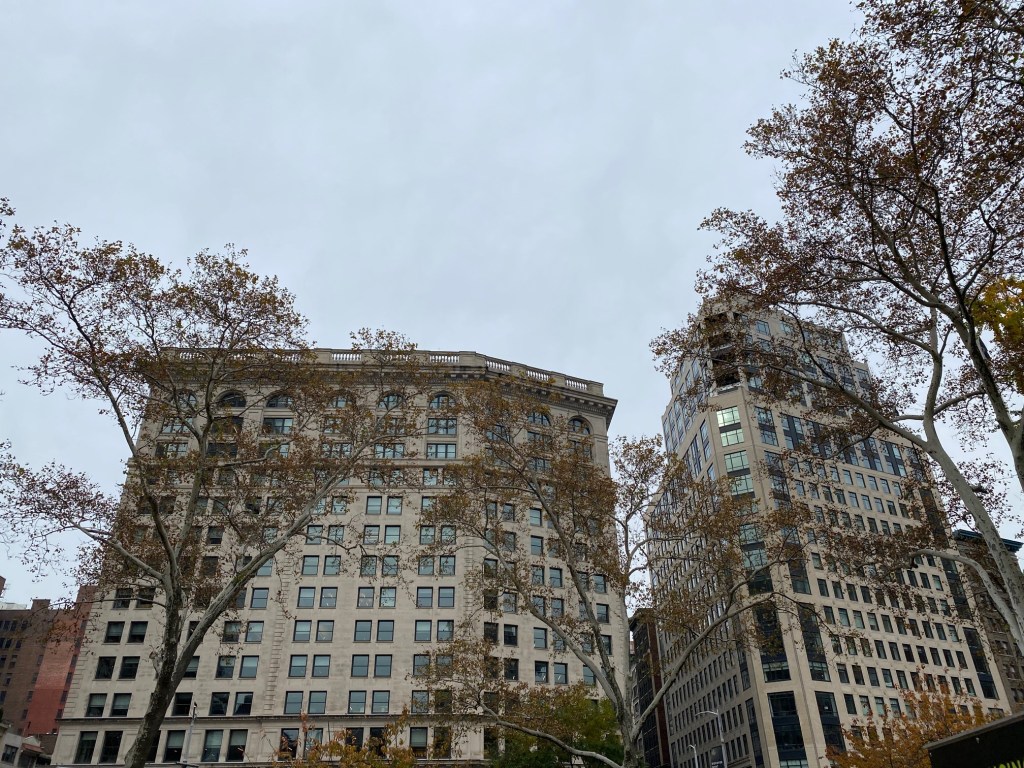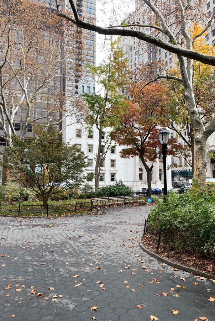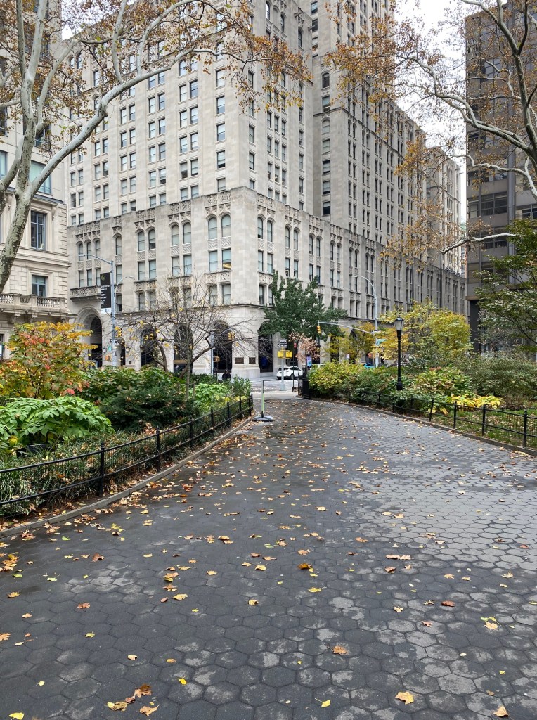 The walking path in Madison Square Park. Here is another perfect example of matching the color of the trees to the buildings.
