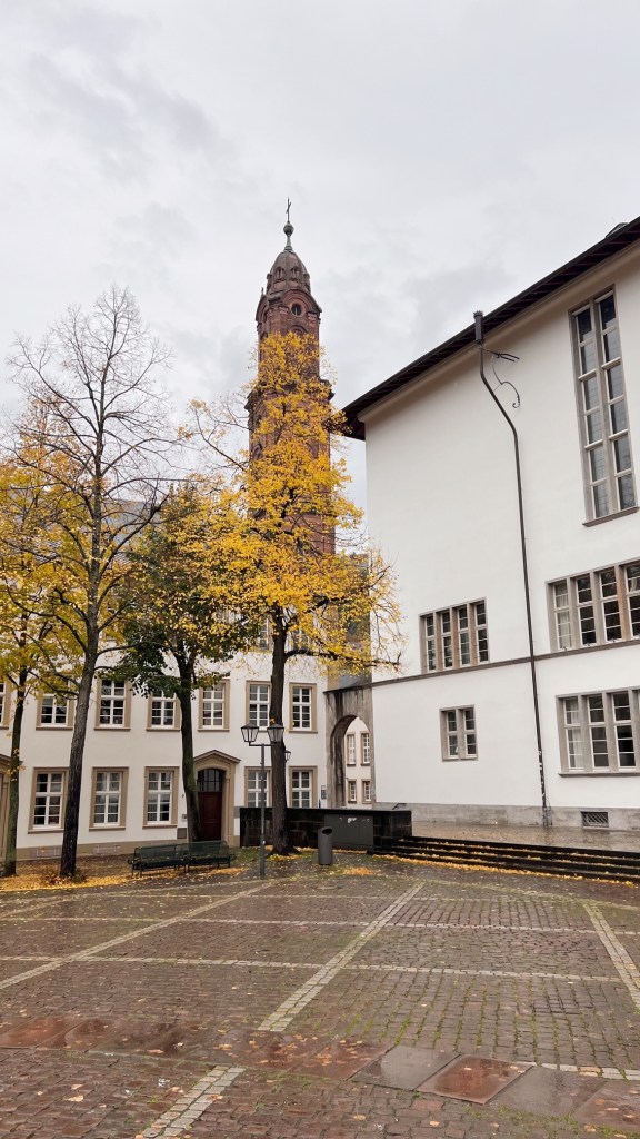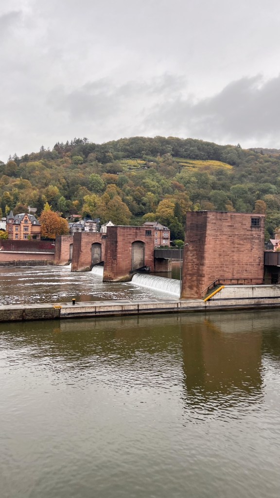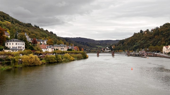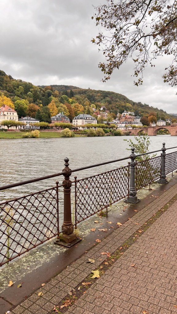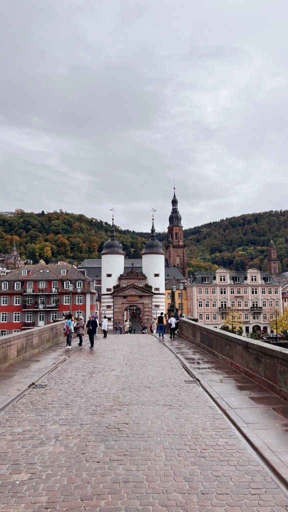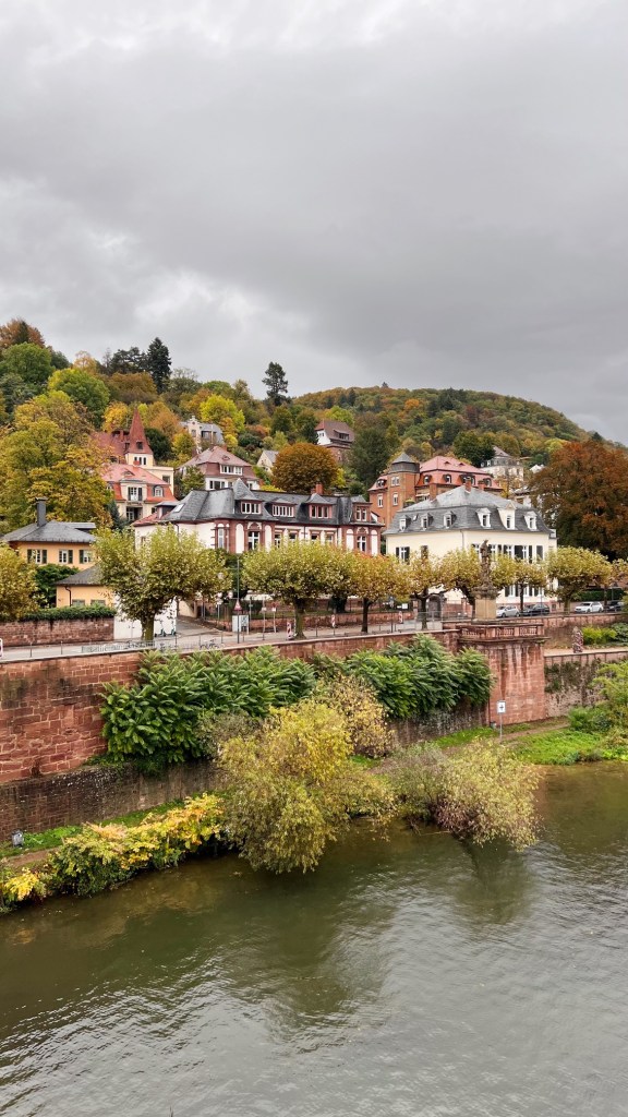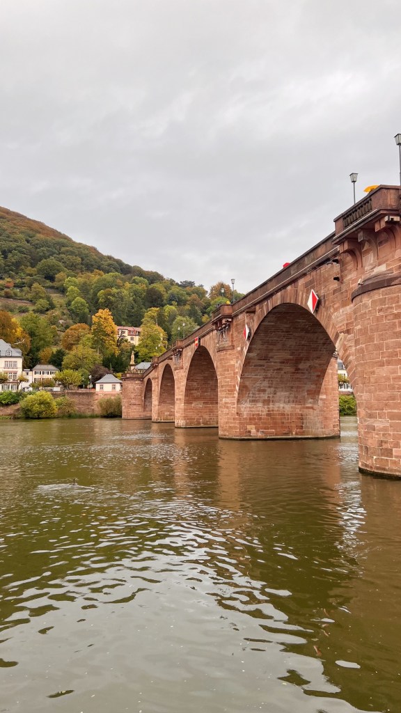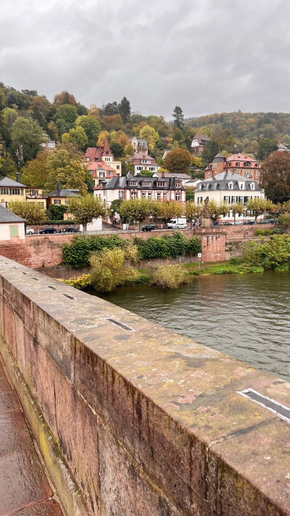 Heidelberg is a university city. These are my favorite types of cities. Long ago someone smartly recognized that the key to intellectual stimulation was to put a university in the center of a walkable city and surround it with trees and beautiful buildings. The university in Heidelberg is situated between the castle and the river. It is the oldest university in Germany and one of the oldest universities in Europe. There are many historic buildings and churches and each are centered around scenic squares. My favorite square was Universitätsplatz (University Square). The square was lined with trees in their fall foliage and there were benches and streetlamps and places to park your bike. I would have loved to go into the university library but they were doing repairs on the outside and I wasn’t sure if it was open. Walking east away from the university into the Altstadt (Old Town) I arrived at the Heiliggeistkirche (Church of the Holy Spirit). The church was built over the course of a few hundred years in a combination of Gothic and Romanesque styles. The Altstadt had lots of old buildings and scenic side streets that led down to the river. Walking away from Heiliggeistkirche towards the river I arrived at the Alte Brücke (Old Bridge) and its iconic brückentor (bridge gate). The brückentor is interesting because it is flanked by two white cylindrical towers that are topped with ornate cupolas. When I got to the bridge the rain and wind began to pick up. The umbrella that I borrowed from the hotel flipped inside out almost immediately after I stepped onto the bridge. But it held up long enough for me to take some pictures of the houses that lined the north side of the Neckar and of the Altstadt on the south side. Standing on Alte Brücke and looking south towards the Altstadt and the Königstuhl I saw the castle perched on the hill like a majestic bird.