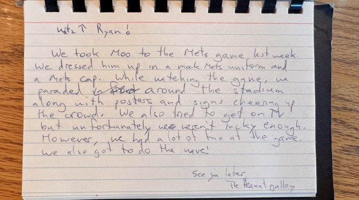 We took Moo to the Mets game last week. We dressed him up in a mock Mets uniform and a Mets cap. While watching the game, we paraded around the stadium along with posters and signs cheering up the crowd. We also tried to get on TV but unfortunately we weren’t lucky enough. However, we had a lot of fun at the game. We also got to do the wave!