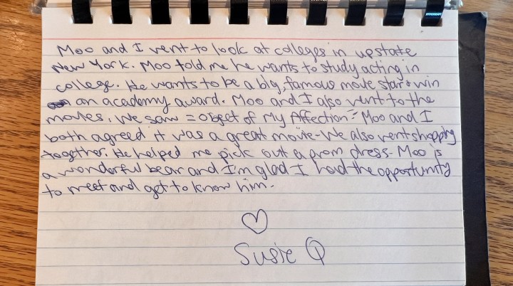 Moo and I went to look at colleges in upstate New York. Moo told me he wants to study acting in college. He wants to be a big, famous movie start and win an Academy Award. Moo and I also went to the movies. We saw Object of My Affection. Moo and I both agreed it was a great movie. We also went shopping together. He helped me pick out a prom dress. Moo is a wonderful bear and I’m glad I had the opportunity to meet and get to know him.