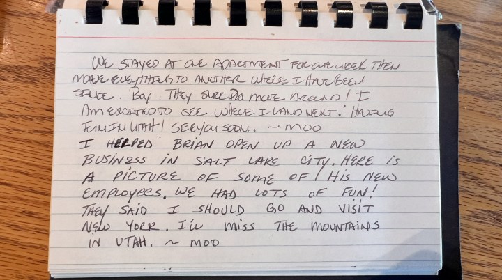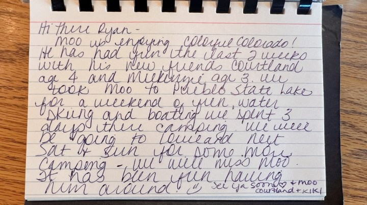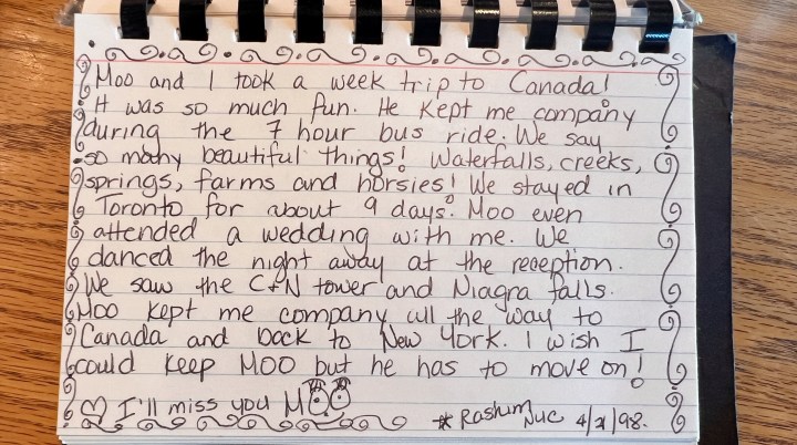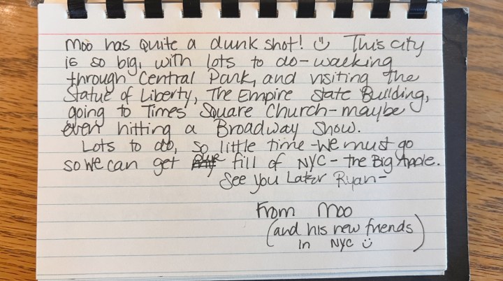 In the fanny pack around Moo’s neck is a journal we made from index cards, laminated black construction paper, and black plastic ring binding. It is about the size of a postcard. On the first page of the journal is the picture of me and Moo in front of our friend.
