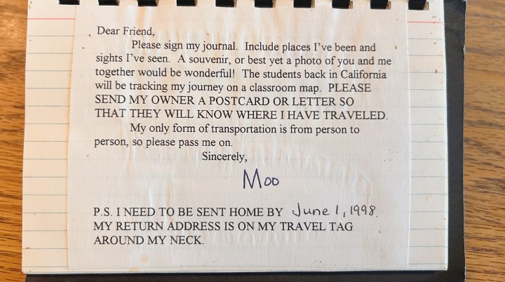 Please sign my journal. Include places I’ve been and sights I’ve seen. A souvenir, or best yet a photo of you and me together would be wonderful! The students back in California will be tracking my journey on a classroom map. PLEASE SEND MY OWNER A POSTCARD OR LETTER SO THAT THEY WILL KNOW WHERE I HAVE TRAVELED.