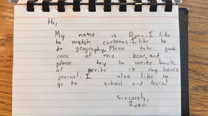 My name is Ryan. I like to watch cartoons. I like to do geography. Please take good care of my bear and please try to write back or write in my bear’s journal. I also like to go to school and learn!