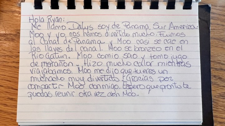 (My name is Dalys, I am from Panama, South America. Moo and I had a lot of fun. We went to the Panama Canal and Moo almost fell into the canal keys. Moo tanned himself in the Gatun River. Moo ate sao and drank cashew juice. It was very hot while we were traveling. Moo told me that you’re a very funny boy. Thank you for sharing Moo with me. I hope you can meet Moo again soon.)