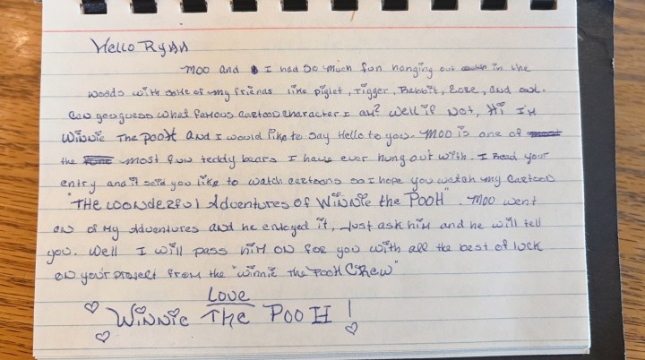 Moo and I had so much fun hanging out in the woods with some of my friends like Piglet, Tigger, Rabbit, Eeyore, and Owl. Can you guess what famous cartoon character I am? Well if not, hi I’m Winnie the Pooh and I would like to say hello to you. Moo is one of the most fun teddy bears I have ever hung out with. I read your entry and it said you like to watch cartoons so I hope you watch my cartoon “THE WONDERFUL ADVENTURES OF WINNIE THE POOH”. Moo went on one of my adventures and he enjoyed it. Just ask him and he will tell you. Well I will pass him on for you with all the best of luck on your project from the Winnie the Pooh Crew.